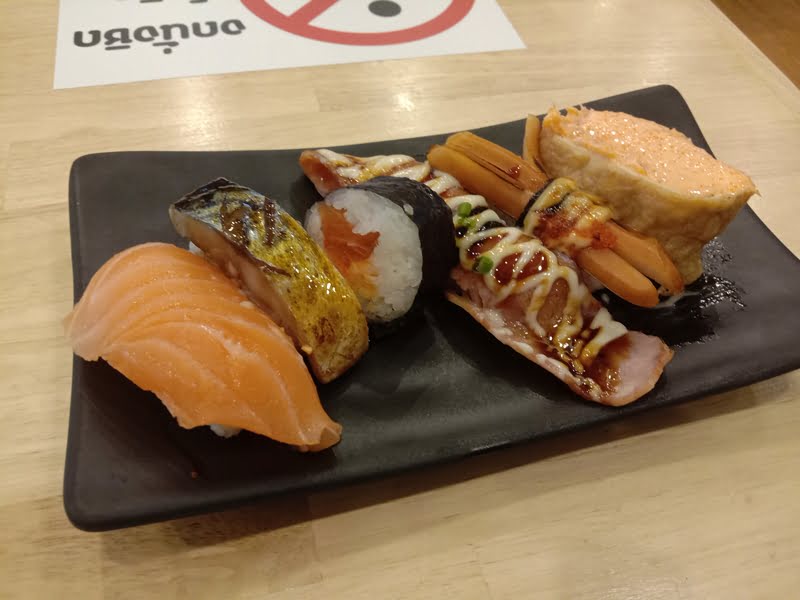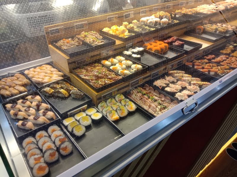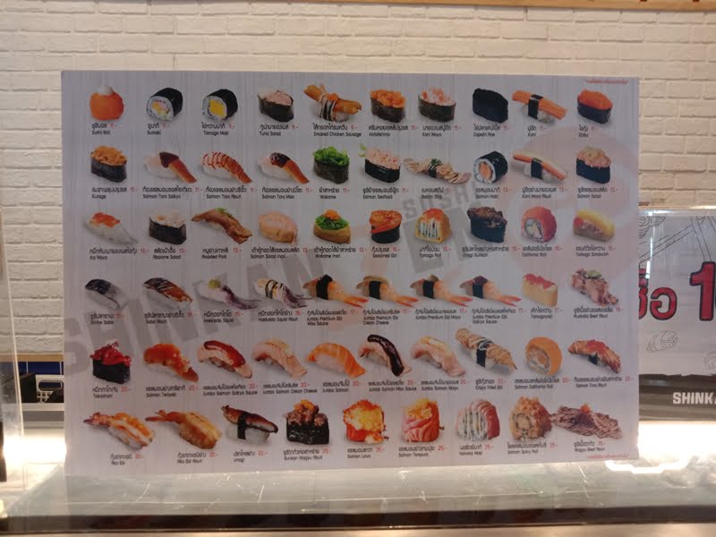回転寿司ではなく、一貫ごとに買えるシステムになっています。値段は9バーツ(約30円)~25バーツ(約80円)。握りと巻物で約60種類が揃っています。