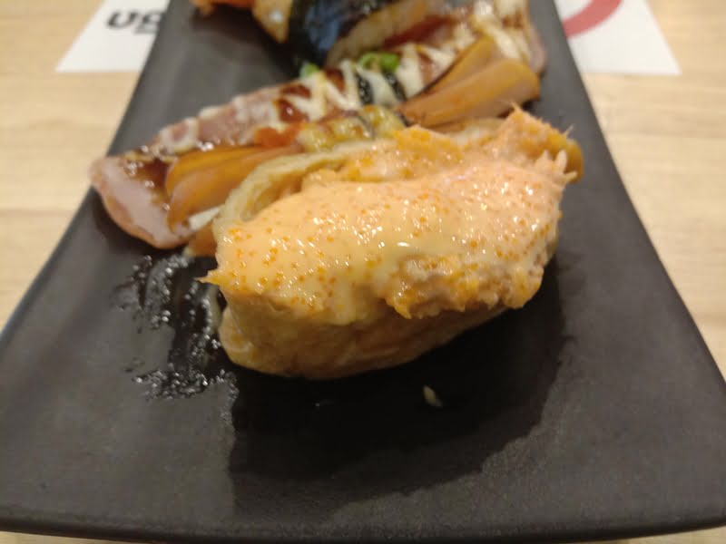 そして、これ!稲荷寿司なんですが、中にサーモンとマヨ、トビコを合えた物が入っています。
