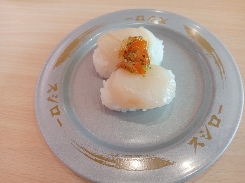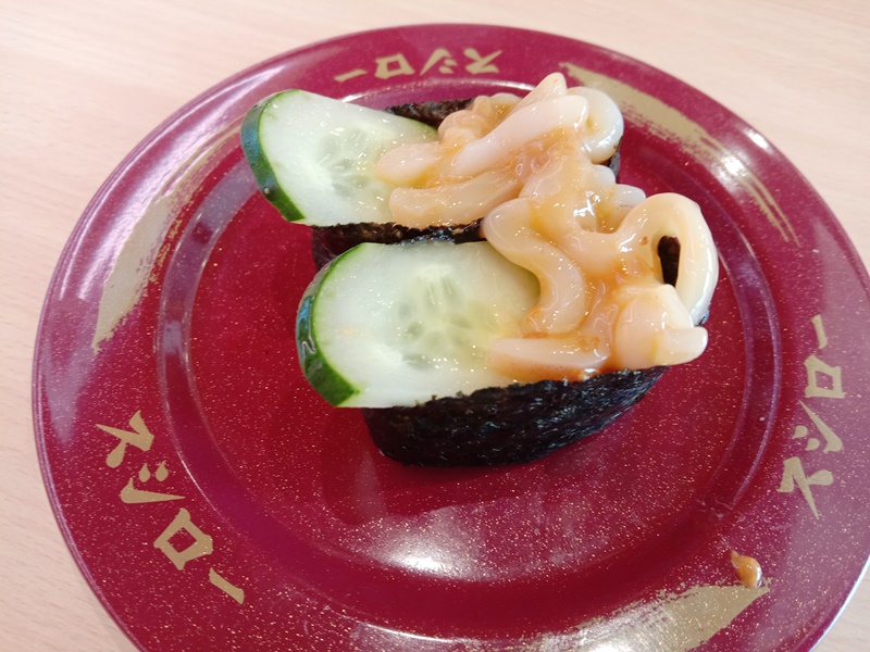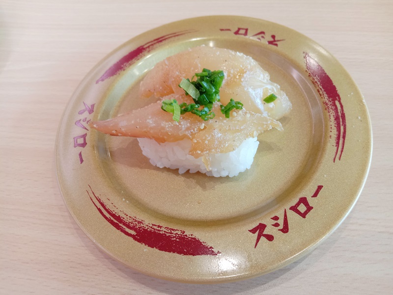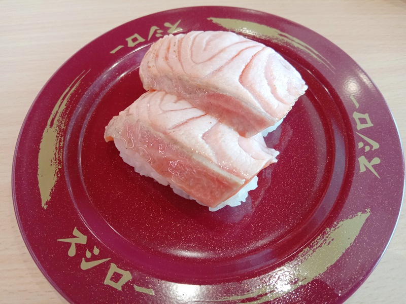 とにかくネタの数が豊富なので、いつも迷ってしまいます。と、その時、レーンを流れてきたのが「漬けゴマ真鯛(80バーツ)」。これ、まだ食べたことなかった!と思わず手が伸びます。按配良くタレに漬かった鯛の身の旨さ、弾力も堪りません。