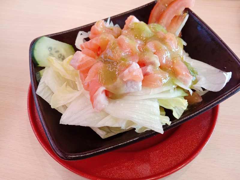 ここで野菜を食べたくなり、「サーモンスパイシーサラダ(80バーツ)」を注文。新鮮なレタスやたまねぎの上にたっぷりのサーモンがのっています。タイでシーフードによく付いてくる緑色のソースがかけられていて、それほどの辛味ではなく日本好みの味付けです。