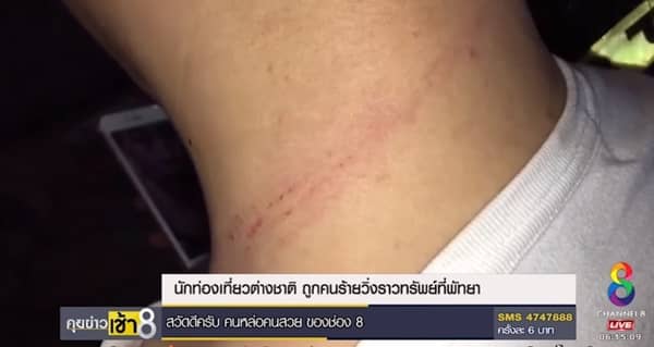 2017年6月14日(水)夜、東京から夫婦で初めてタイに観光旅行に来た日本人男性(29歳)が、パタヤに到着したバスを降りてから、わずか10分後に、5万バーツ(約16万3080円)相当の金のネックレスをバイクに乗った強盗に引ったくられる事故に遭っています。